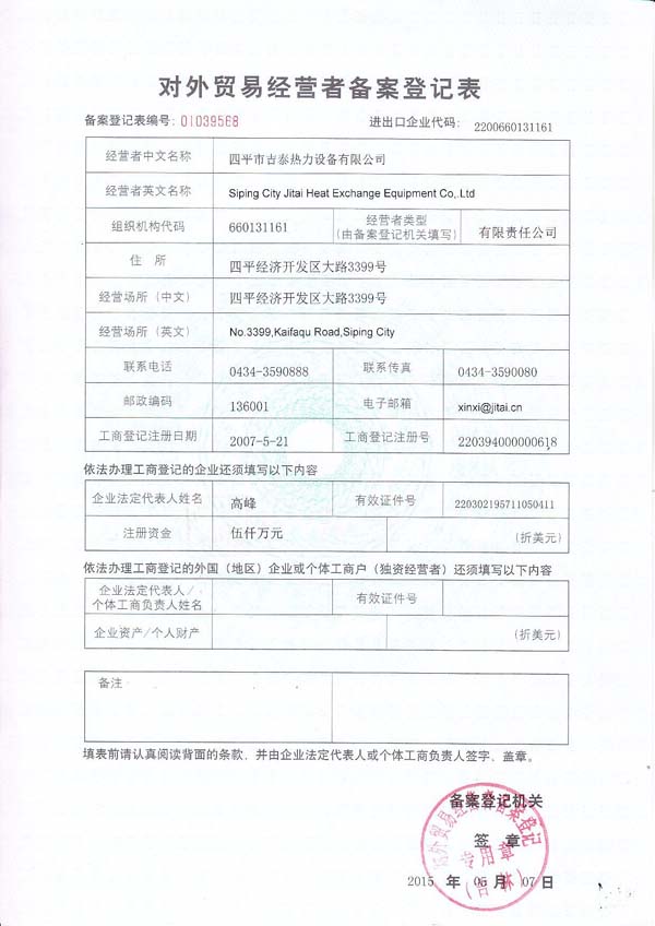 SIPING JITAI HEAT EXCHANGE EQUIPMENT CO.,LTD.
